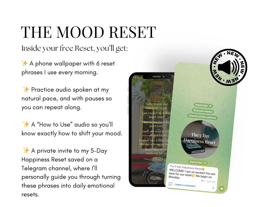 ✔️ Private access to a 5-day Happiness Mood Reset saved on Telegram (it’s like a private podcast)